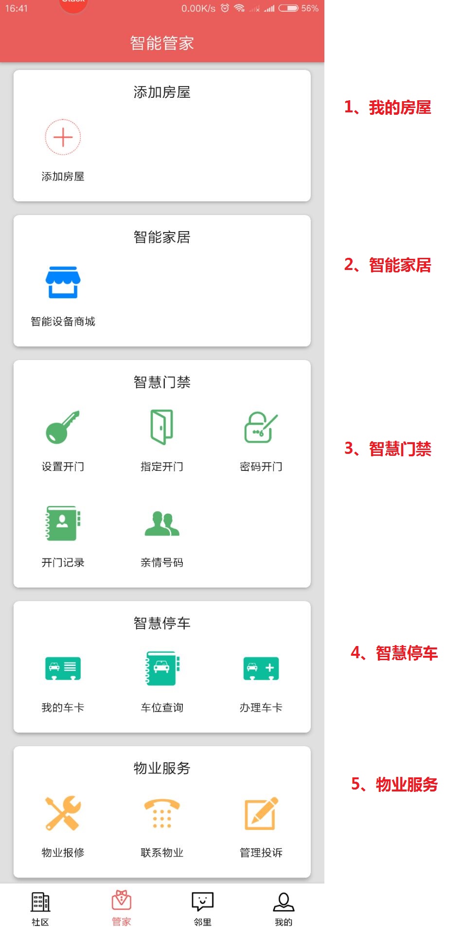 管家分为5部分,从上至下分别是:我的房屋,智能家居,智慧门禁,智慧停车,物业服务。