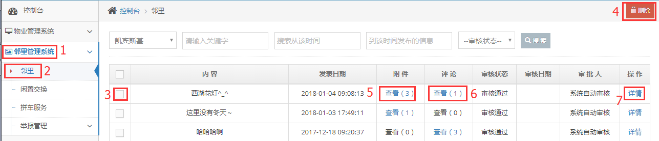 按照1,2步骤切换至邻里,3,4步可以删除该条动态,5是查看该动态的图片,上面的数字表示的是有几张图,6是查看该动态的评论,并可以对该评论进行删除操作,7是该动态的详情。