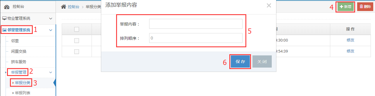 1-4步骤点击新增按钮,输入举报分类(如:涉黄、赌博等),点击保存即可完成添加。
