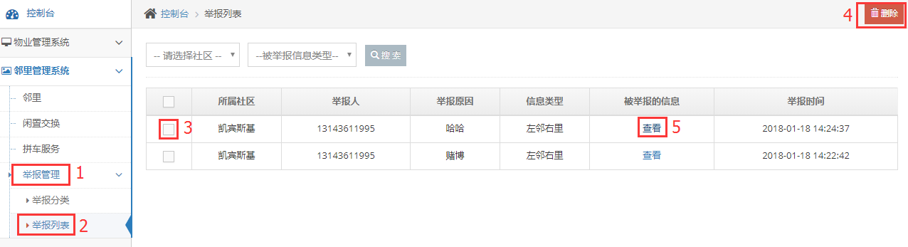 举报列表是用户举报了某条动态通知到后台的,按照1,2步定位到该页面,3,4操作为删除该条举报信息,5可以查看该举报对应的动态信息,并对动态做出处理。