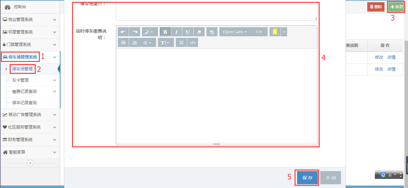 按1,2,3步骤点击增加按钮,4输入信息,点击5保存即可完成停车场的增加。