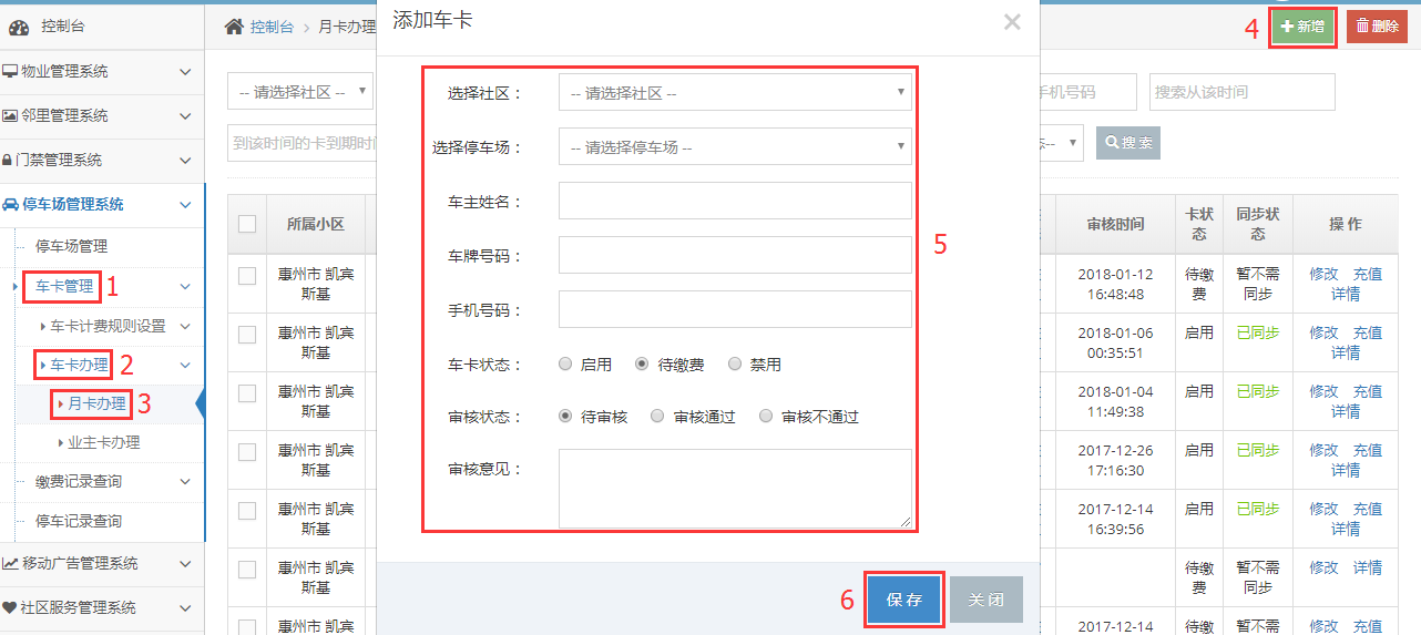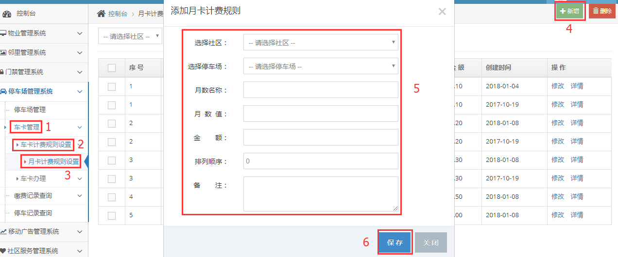 该操作是设置车卡月卡的计费规则,按1-4步骤点击新增按钮,5输入信息,点击保存即可完成。