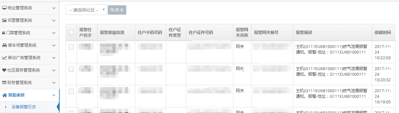 该功能是查看该社区内所有住户智能设备的报警信息。界面简单,不做详细讲解。