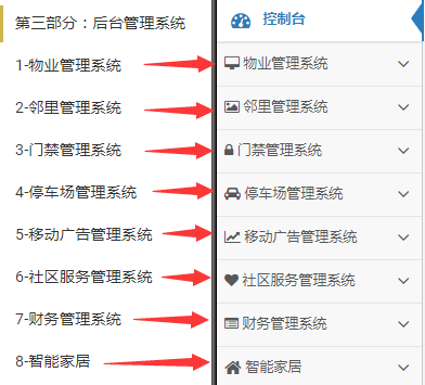 你看到的下图左侧是该文档该部分的目录,右侧是亿社区后台管理系统的菜单栏,它们之前是对应关系,如果你对亿社区后台管理系统有任何含糊或不明确的地方,可以在该文档中快速定位到你想要知道的地方。