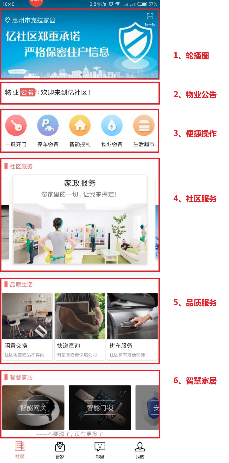 首页分为6部分,从上至下分别是:轮播图,物业公告,便捷操作,社区服务,品质服务,智能家居。